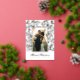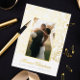 Send merry wishes of the season and share your happy news with family and friends on this wedding themed Christmas card. Swap the phot for your best shot from the big day and edit the name and date on the front, plus personalise the long message on the back with your own heartfelt sentiments. The traditional and timeless motif of carved wood work and filigree artisanship shine in real metallic gold foil to bring festive glamour to this dual purpose wedding announcement and winter holiday greeting card.