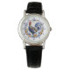Bright, cheerful gold flowers and blue leaves make a pretty frame around a colorful blue rooster on this watch. Blue numbers make the watch easy to read, and a thin blue circle frame separates the inside floral and rooster image from the numbers. Everything stands out on a crisp white background. Cute!