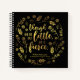 On the front cover, this literary notebook features the quote from William Shakespeare’s A Midsummer Night’s Dream “Though she be but little, she is fierce” surrounded by flowers and leaves in faux gold foil against a black background.
