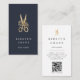Elegant vertical business cards for hairstylists feature a pair of stylist's shears in faux gold foil adorned with flowers, on a rich navy blue background with two lines of custom text in white. Customise the back with your full contact details, along with a customisable QR code, displayed beneath a smaller matching scissors illustration.