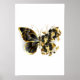 Gold flower butterfly with black jewellery orchid, decorated with gold leaves on white background.
