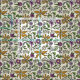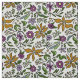 Floral illustrated fabric for sewing and crafts. Flowing golden flowers, along with purple blooms, and tiny yellow bell-shaped flowers make a seamless, repeating pattern on ecru color. Leafy green stems and branches add to the cottage garden feel of this design. Choose your favorite material.