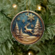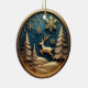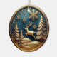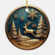 This round ceramic reindeer ornament features an elegant gold coloured frame that encircles a gold festive design. The background showcases a serene Christmas snowy night scene, with a dark blue sky filled with snowflakes. Below, a picturesque winter snow landscape with trees is softly illuminated by the glow of the moon. Gold deer with antlers gracefully flying adds a touch of magic and Xmas holiday spirit to the ornament. Same Image is on the front and back. This ensures that no matter how the ornament turns, it always looks festive and complete. 🦌🎄