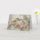 Glistening gold foil and glitter adorn chickadees on an evergreen branch, surrounded by red berries and snowflakes. The vintage grey background enhances the festive feel.