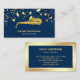 Professional Saxophonist business card featuring beautiful gold stars confetti with faux gold foil accents on a navy blue background. Add your name and contact details to make a lasting first impression.