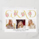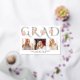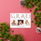 Gold foil GRAD typography photo graduation announcement. It features the word "GRAD" in a decorative font in gold foil, bouquets of pink roses and three photos. The backside features a pattern of white graduation caps on gold.