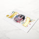 Real gold foil Joy with berries Christmas photo Holiday Card. It showcases the word "JOY" in real gold foil with red berries and greenery while instead of the letter "O" there is your photo. The back includes gold polka dots.
