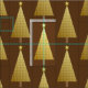 A simplified modern take on a classic Christmas tree motif, gold foil-look gradient / brocade in an antique floral wallpaper design on a deep chocolate brown background