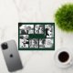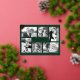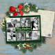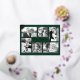 Gold foil Christmas photo postcards with six photo templates. The frames and text are foil, and so is the snowflake in the upper corner. Gold is shown, with two other colors to choose from. Add photos of the family and pets in horizontal, vertical and square orientation. Your photo will fill each template. The pictures surround central text. Add a preferred greeting and signature. The dark, forest green background color works with either color or black and white pictures. The back of the card contains lines for handwriting addresses over a snowflake background.