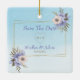 Modern art deco gold frame and lavender and beige roses with leaves. Silver diamonds in the middle with monogram. Gradient blue background