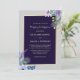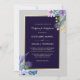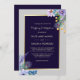 This pretty wedding invitation features modern floral bouquets in predominant colours of blue and violet at the top right and bottom left corner. The bouquets differ from each other, but are similar. The top has touches of pale gold. Each of them include a colourful boho style peacock feather. The images are laid over a shiny gold frame, with a navy blue background. Your custom text is in light gold at the centre. The framed centre is placed on a silver grey background. The back of the invitation is solid matching navy blue. Elegant, modern, and appropriate for weddings in any season!