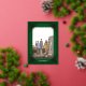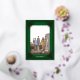 Your photo and family name decorated with a fancy gold frame on a pine forest green background. The background has green and gold diagonal stripes with gold holly. Photo Credit: Photography © Storytree Studios, Stanford, CA