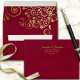 This beautiful wedding envelope is features a burgundy, maroon, or wine red coloured background with gold floral curls and swirls on the inside flap. There is a printed return address on the back flap in fancy script lettering. The design is understated and simple, yet classic, chic and ornate. Perfect way to make your wedding invitations all the more special.