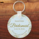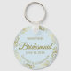 These keychains are designed to give as favours to bridesmaids in your wedding party. They feature a simple yet elegant design with a pale powder blue coloured background, gold script lettering, and a lacy golden faux foil floral border. The text says "Bridesmaid" with space for her name, the names of the couple, and the wedding date. Perfect way to thank your bridesmaids for being a part of your special day!