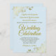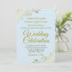 This beautiful wedding invitation is stylish, simple and elegant. It features gold script lettering on a pale powder blue background with floral faux foil filigree in each corner. The understated design is offset by the ornate frills and swirls of the artwork. The back has a customisable QR code and details note so you can direct your guests to a website for information and RSVP.