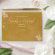 This striking envelope pairs a luxurious gold front with a rich emerald green back for a sophisticated two-tone finish. The front is adorned with subtle botanical etching and customisable guest names, while the back reveals shimmering gold when sealed. Gold-lined interior and flap add to the luxe experience. Perfect for garden, jewel-tone, or winter weddings with a high-end feel.