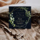 This gold geometric green blue wedding invitation is perfect for a simple wedding. The design features hand-painted beautiful green leaves in a dark blue background, adorning a gold geometric frame.