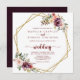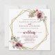 This gold geometric rustic floral front and back wedding invitation is perfect for a simple wedding. The design features burgundy, pink and blush watercolor flowers with green leaves adorning a gold geometric frame.