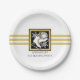 The design features a pair of ice skates over a snowflake crest with faux gold glitter, black, and white background. This elegant winter sports design serves as modern and unique paper plates with personalised text for ice skating themed birthday party, Christmas, and more!