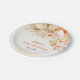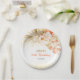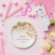 Elegant and stylish floral birthday paper plate features stunning watercolor yellowish orange flower with beige leafy greenery and long gold glitter rain garland. Perfect party supplies for flower themed birthday celebration.