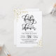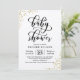 The stylish baby shower invitation features a sprinkling of faux gold glitter confetti and a modern calligraphy font.
