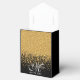 A simple and elegant favour box in midnight black with a spash of gold glitter confetti with contrasting white ribbon and lettering. You can personalise it by clicking on the customise menu. This is part of a luxurious wedding suite that can be fully personalised.