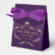 Elegant deep purple background with gold and white glitter texture crown and swirls frame, customisable text favour box design.