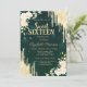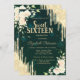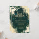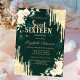 A modern, chic and glamourous invitation with glitter drips, and flowers on a green background.