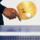 A faux gold looking background with faux gold glitter drips, paint dripping look. Personalise and add a name and monogram initials. The name is written with golden modern block letters. Black letters.