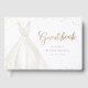 Elegant bridal shower guest book feature watercolor white wedding dress with sparkle faux gold glitter guest book script.