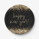 Gold Glitter Elegant Script Happy New Year Black Paper Plate