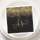 Glam Gold Glitter Elegant Monogram Napkins. Easily personalise this trendy chic napkins design featuring elegant gold sparkling glitter on a black background. The design features your handwritten script monogram with pretty swirls and your name.