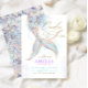The back of the invitation features a beautiful pattern of mermaid scales in soft pastel colours, accented with shimmering gold, adding a touch of elegance and whimsy to the overall desig