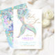 The back of the invitation features a beautiful pattern of mermaid scales in soft pastel colours, accented with shimmering gold, adding a touch of elegance and whimsy to the overall design