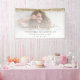 Gold Glitter Photo Script 2024 Graduation. A faux glitter border is at the top and Congrats to our Grad is in an elegant script with swashes. Easily personalise the text to your own requirements, and replace the sample image with your own.