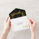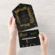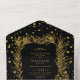 Gold glitter pine frame with cone confetti black winter Christmas wedding All in One Invitation. A lovely wedding design that includes a gold pine frame with cone and needles and confetti on black background. The RSVP card is detachable.