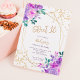 A chic spring, summer purple, lavender and green floral watercolor and gold glitter confetti typography Sweet 16 birthday party invite with hand painted flowers, greenery watercolor leaf branches with gold geometric terrarium frame on white background, add your photo at the back