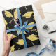 Black and gold school colours, gold graduation caps thrown in the air for both him and her. Nice graduation party gift wrap for a grad party, for a graduate from a high school, college, or university with school colours of Black and gold.