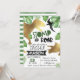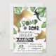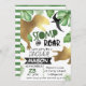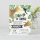 Looking for a bold dinosaur invitation for your little boy's birthday party? This design features two gold dinosaur silhouettes, green tropical foliage black banner and bold green and back heading. This is a cool way to invite your little boy's friends and family to his dinosaur themed birthday party.