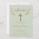 Faux gold foil typography elegant light green olive grey with gold cross confirmation. A modern confirmation party invitation with this modern, simple, elegant and chic faux yellow gold brush hand lettering typography on a purple blue background. Perfect for simple, elegant and modern party. If you need any text changed and customised don't hesitate in contacting me!