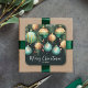 Elegant Merry Christmas holiday stickers feature pine branches, green and gold Christmas ball ornaments and ribbons on a dark green background with your nain chic lettering, perfect for your festive holiday gathering or for your gift-giving.