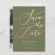 Elegant and simple wedding save the date card. The hand lettered typography text is in faux gold glitter against an olive green background.