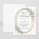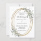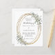 A white background. An oval faux gold looking frame decorated with sage green greenery. Personalise and add your names, details. Black text.