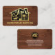 An exquisite timber grain layer features a gold home that has an array of gold handyman construction tools. These gold tools can represent some of the services that you might offer. Just below this gold design lies the business name.