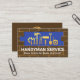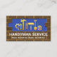 A brown brick wall cover with a blue cut off section at the top features a creative gold handyman tools design. Near the base of the card is the business name and its contact details.