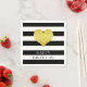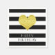 Happy birthday party paper napkins with a faux gold foil heart on a black and white striped pattern. Matching party decor available.