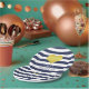 Set of birthday party paper plates with a faux gold foil heart on a blue and white striped pattern. Matching party decor available.