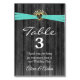 Aqua ribbon in heart with baby's breath bouquet on rustic dark grey barn wood for table number tent.