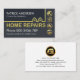 Cover features a faux gold home border line with an underlying faux gold "HOME REPAIRS" signage. The gold border acts as a demarcation for an upper dark blue layer against a lighter shade below. To the right of this is an array of gold construction tools icon which can represent some of the services that you offer. At the top of the card lies your prestigious name and job title with the contact details and a slogan caption near the base.