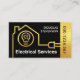 An all black cover features a gold home electrical circuit design with the power plug connected to a gold layer that has your contact details. Over at the top corner lies your prestigious name with the contact details near the base. Inside the home circuit is a gold light bulb logo with repair tools which you can use.